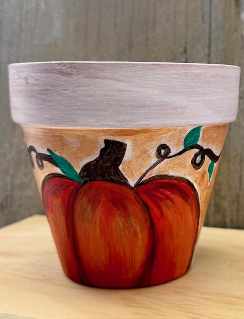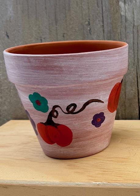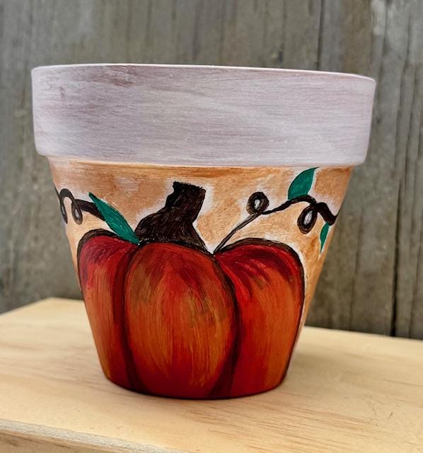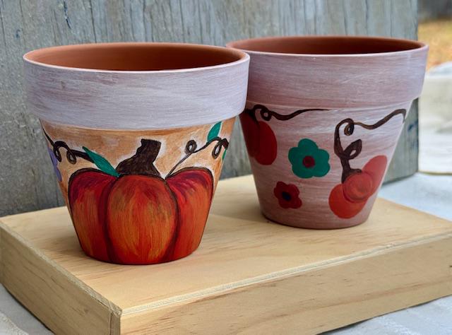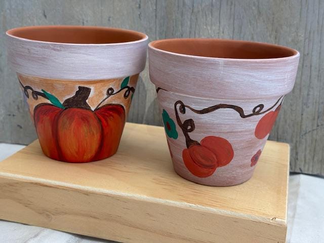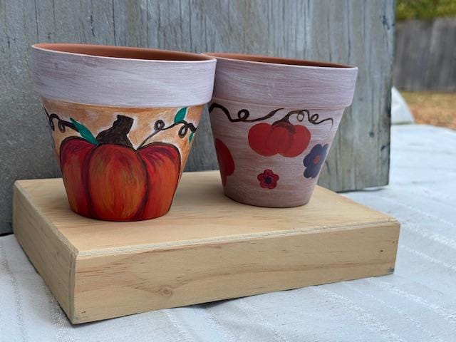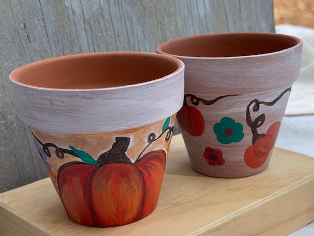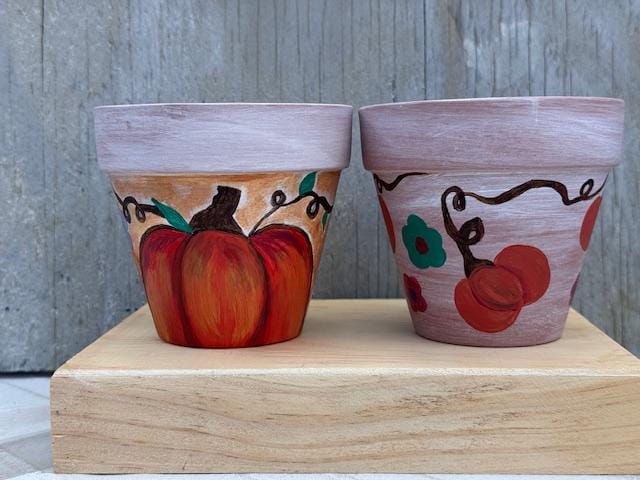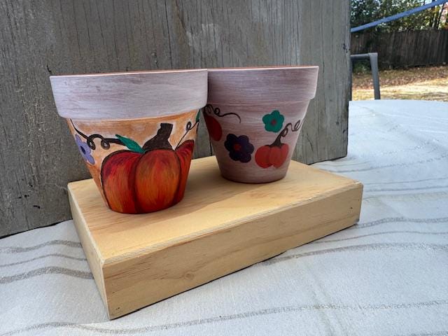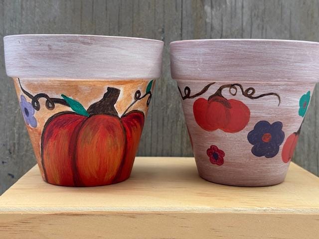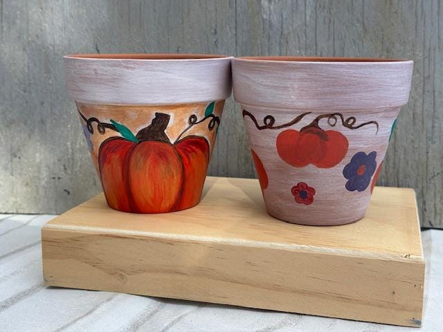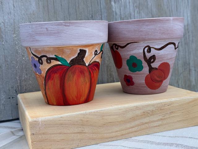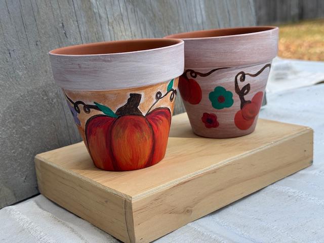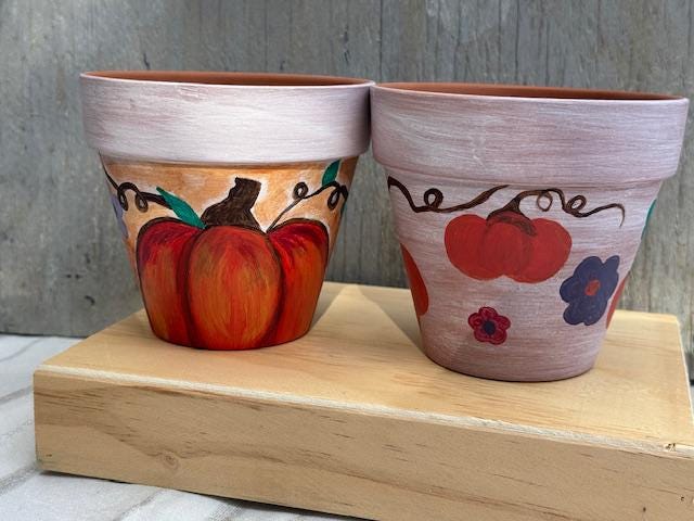 Each pot is a one-of-a-kind piece, featuring a rustic whitewashed top and a natural terracotta base. The larger pot showcases a vibrant, hand-painted pumpkin and whimsical vine-and-leaf design. The smaller pot complements it with a matching whitewashed top and a charming floral pattern with warm, autumnal colors. These pots make for a great housewarming gift or a lovely addition to your own fall decor.
